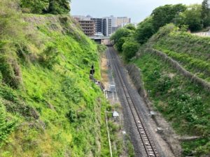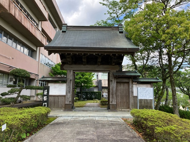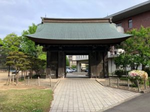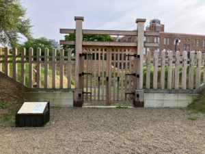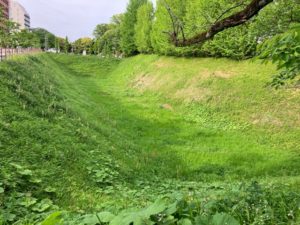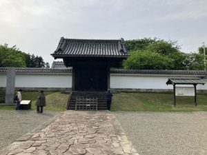 高校の敷地内に入り、薬医門を見学。今は鉄道の走っている深い堀