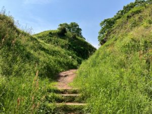 前日に酒々井町中央公民館に行くも17時過ぎてスタンプもらえず。とりあえず先に本佐倉城に向かう。駐車場に着くと案内所があり、スタンプも資料も入手できました。資料はとても充実しています。11年前は、郭までたどりつけず、写真も1枚のみと散々でしたが、今回は、月星紋盾、大堀切、土塁、虎口、郭群など歩き回り、堪能できました。佐倉城より楽しいです。