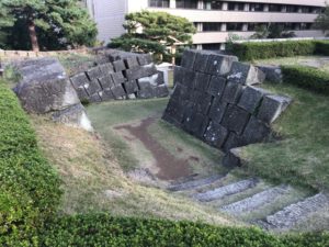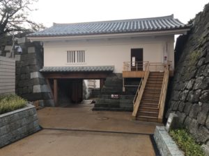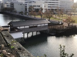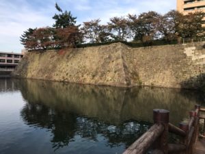 本日最後の登城は、福井城。初見参です。現在は県庁が建っています。休日ですのでスタンプが欲しい方は休日通用口から入ります。インターホンで呼び出し。福井城は結城秀康が初代藩主で北ノ庄城を大改修したものです。見所は石垣、水堀、御廊下橋、山里口御門、舎人門、外堀。養浩館庭園を見学して、付近を散策していると舎人門、外堀?が確認でき、福井城の大きさを実感できました。ひ、広い!